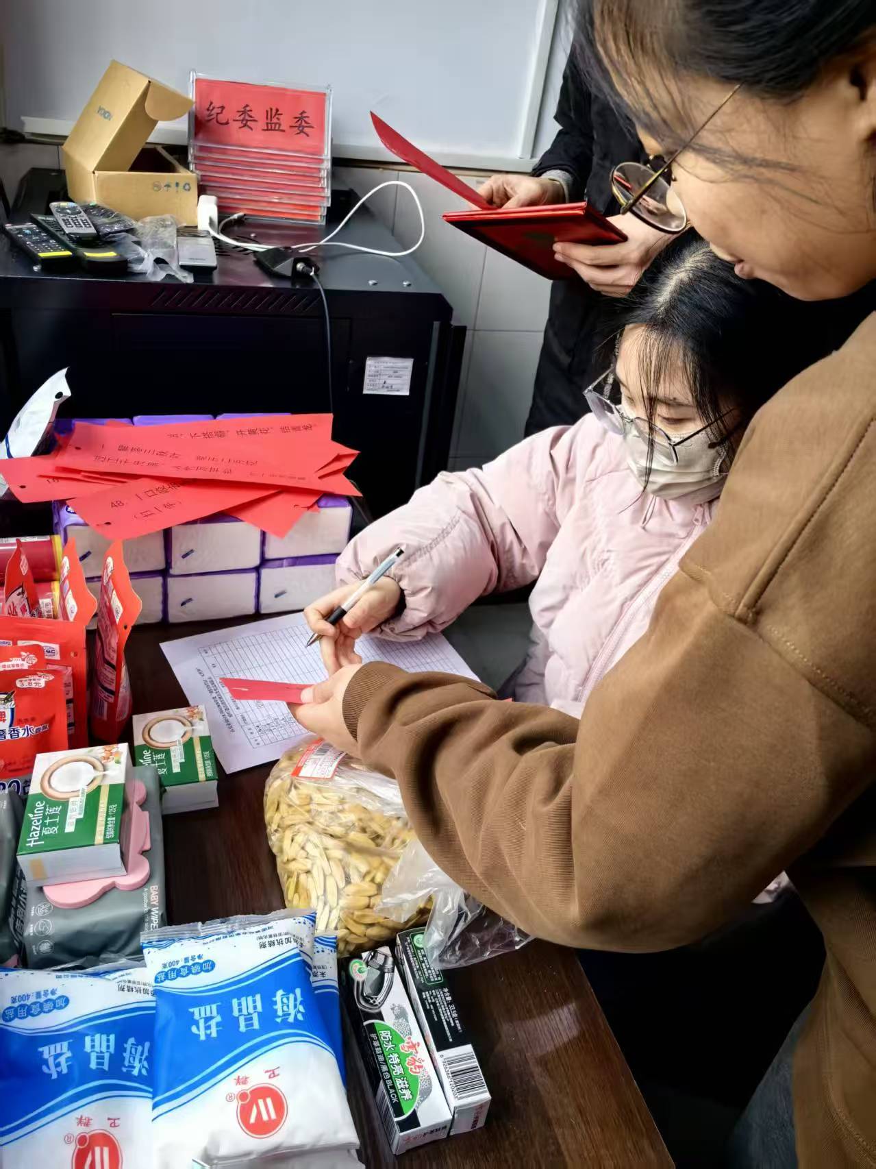 大家踊跃参与、认真思索,遇到难度较大的谜题便相互交流、集思广益,在协作探讨中共同破解谜底。猜对灯谜后,大家有序前往兑奖区领取奖品,现场洋溢着喜庆和谐的节日气息。