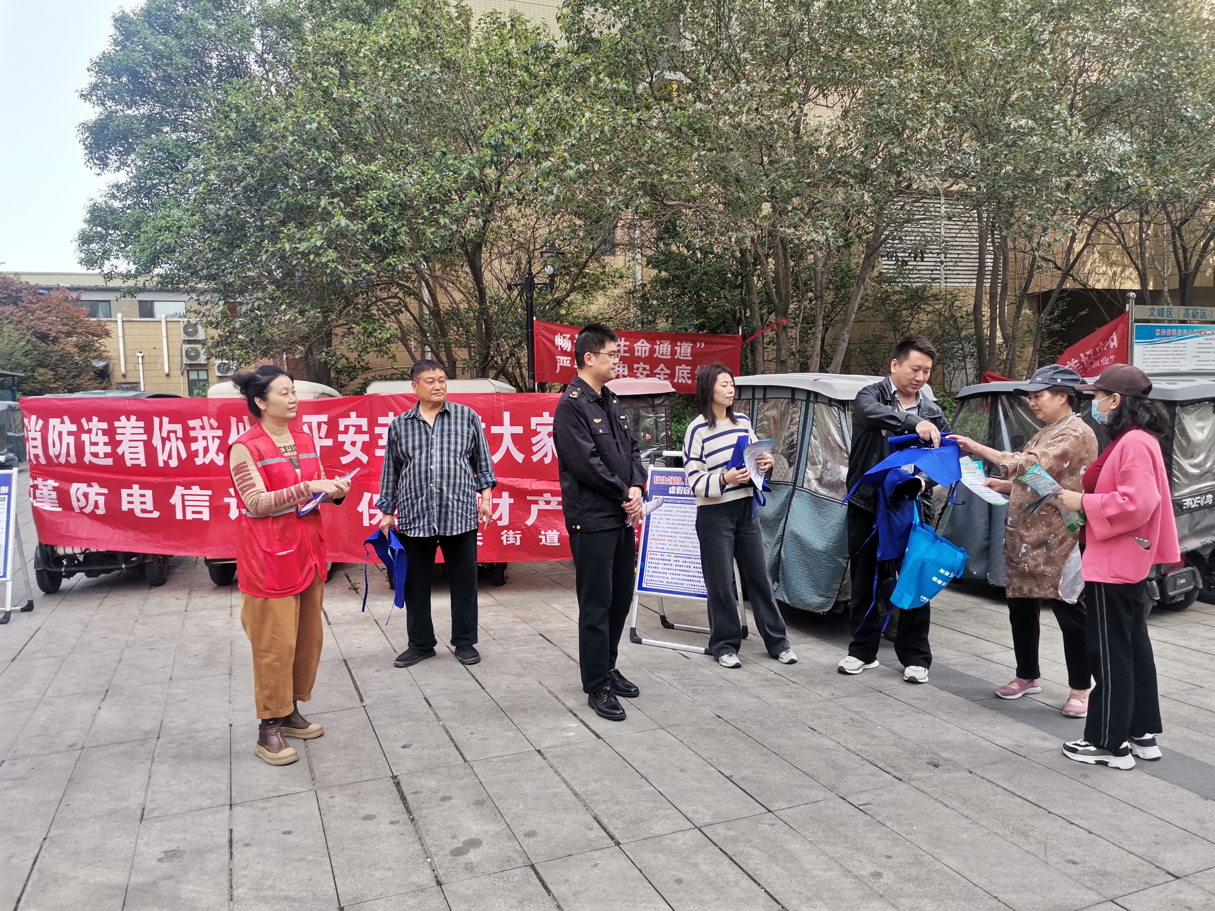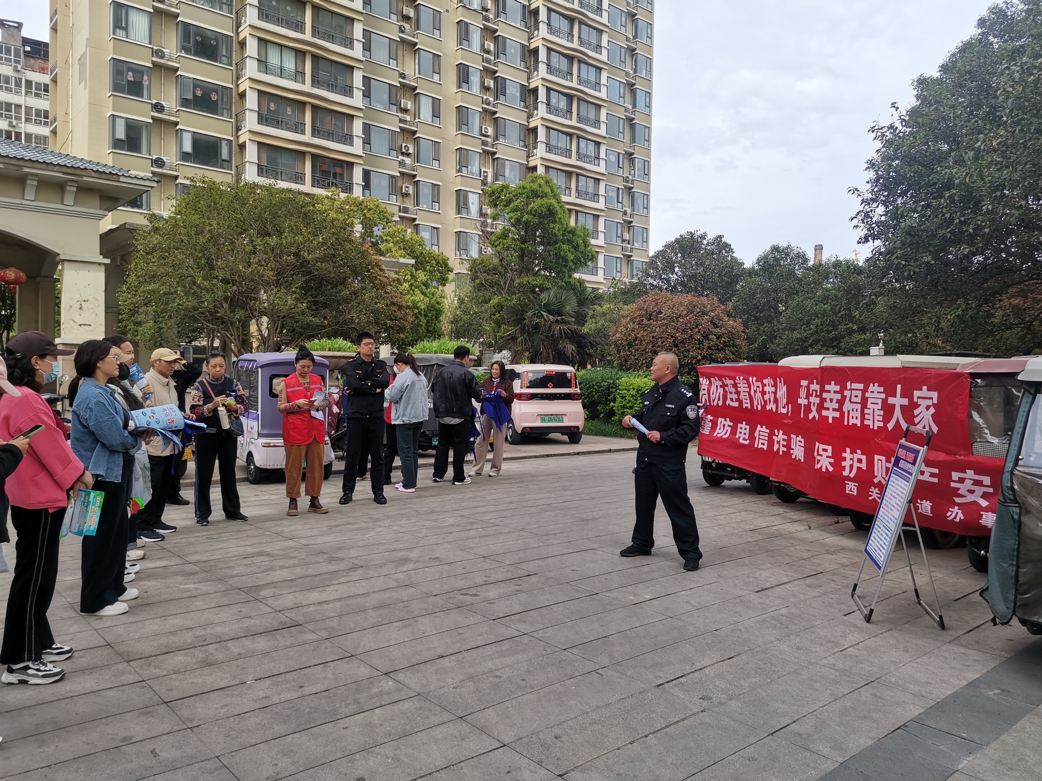 活动中,街道充分发挥民警专业优势与网格贴近群众优势,采取“线上+线下”相结合的方式,聚焦反诈防骗、消防安全、治安防范、用电用气安全等重点内容,通过广场宣讲、张贴条幅海报、发放宣传资料、宣传礼品、微信群推送提示信息等形式,向居民普及安全知识。民警结合典型案例,细致讲解电信诈骗、火灾隐患、矛盾纠纷等常见风险的识别与应对方法;网格员深入楼栋院落,提醒居民规范停放电动车、清理楼道杂物、安全使用燃气、防范电信诈骗,切实把安全提醒送到家门口。